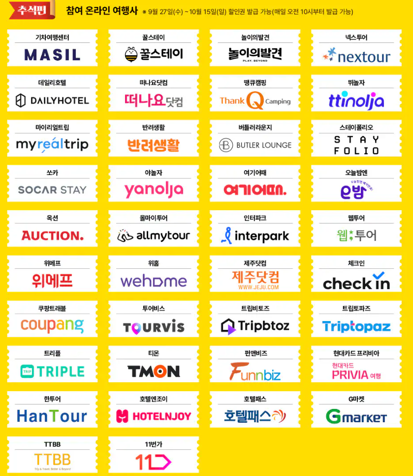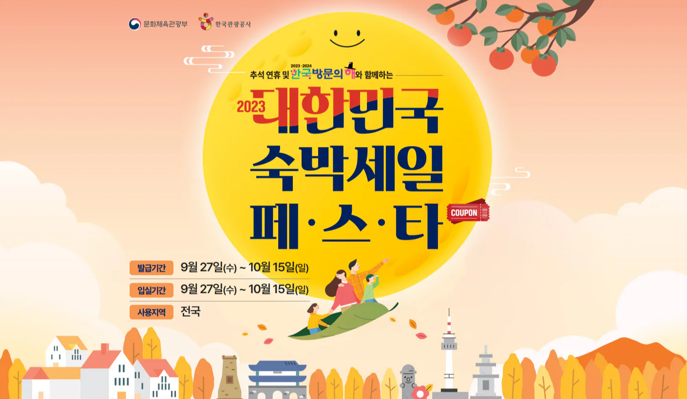 추석을 맞이하여 9월 27일 ~ 10월 15일까지 전국 어디서나 사용가능한 숙박비 3만 원 할인쿠폰을 지급한다고 합니다.
