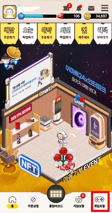 이마트 24 앱에서는 우측 아래에 게임포탈을 들어가면 여러 가지 게임을 즐길 수 있는데 그에 따라 이벤트도 자주 하니 한번 둘러보면서 혜택만 챙겨가셔도 좋을 거 같습니다.