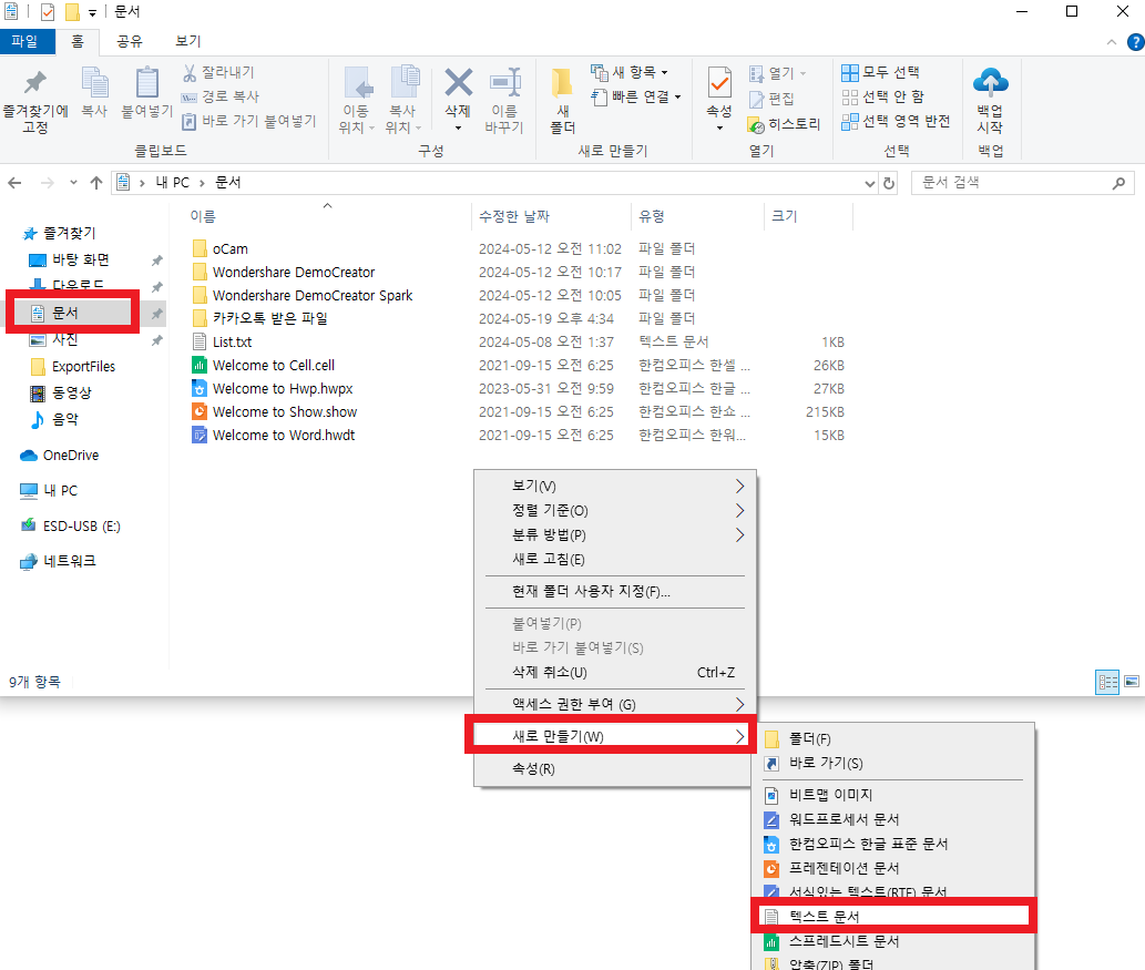 컴퓨터에 문서파일로 접근한 뒤에 새로만들기 텍스트 문서를 눌러주세요