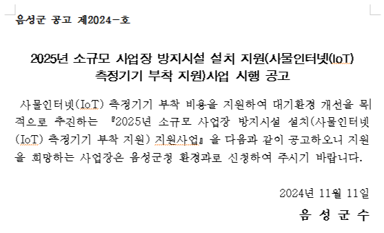 안녕하세요 오늘은 음성군청에서 사물인터넷(IOT) 관련 신청관련 내용이 공고로 올라오게되어 내용 전달 드립니다.