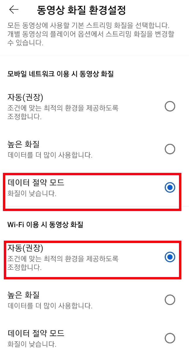 마지막으로는 와이파이 설정은 자동(권장)으로 추천드립니다. 와이파이라고 높은 화질을 선택하실경우 버퍼링이 걸리는경우가 많기 떄문입니다.