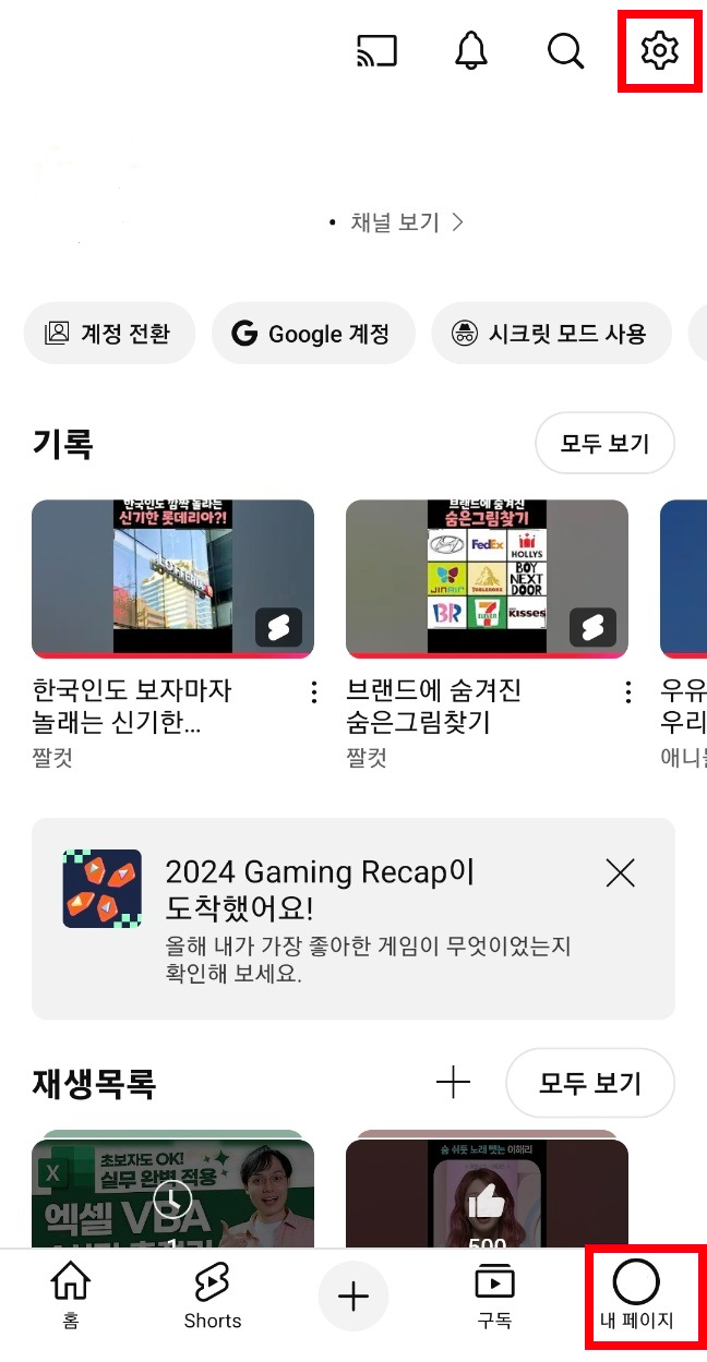 우선 유튜브 메인 화면 우측하단에 내 페이지 버튼을 눌러주세요