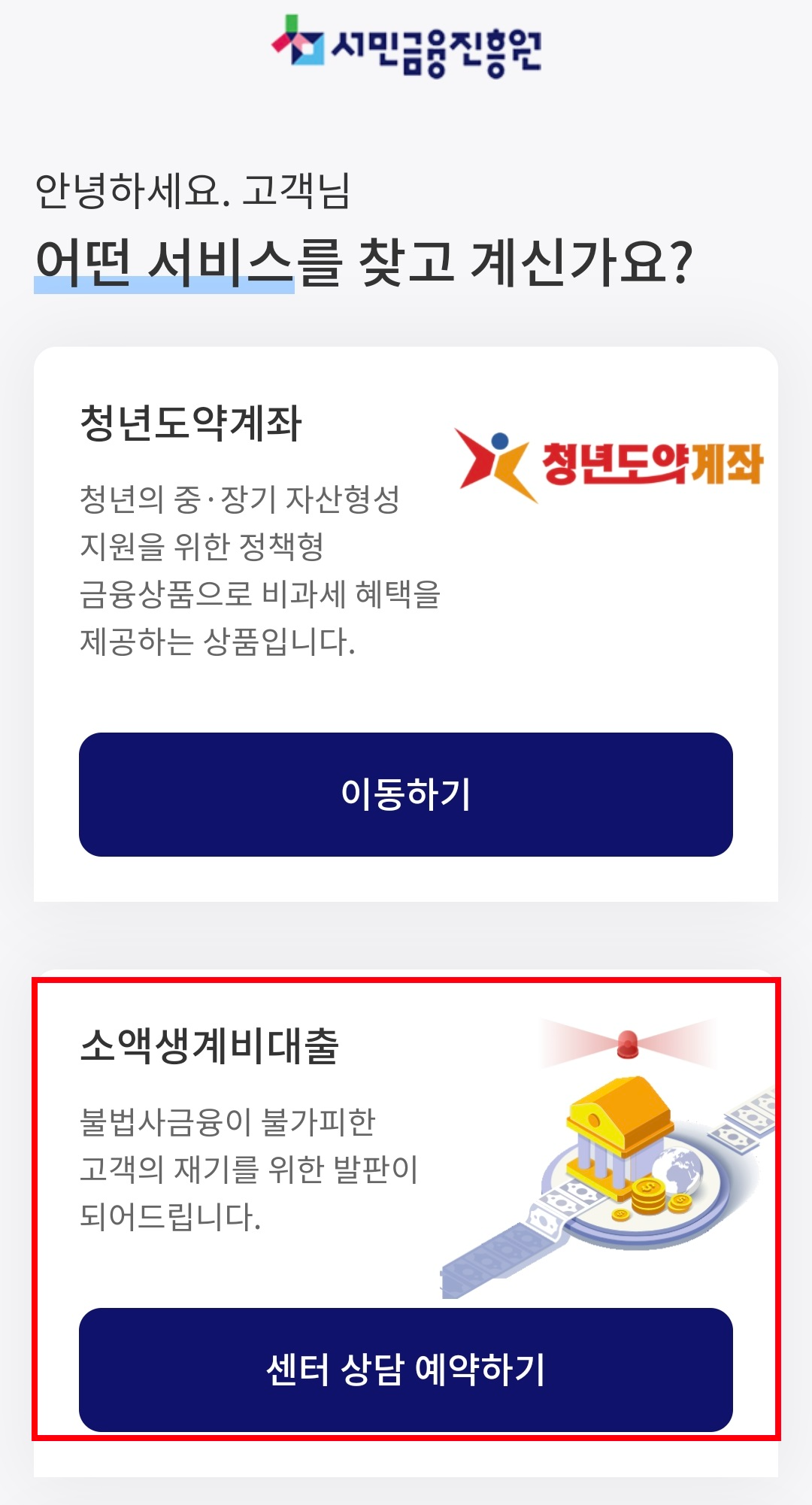 소액생계비대출은 일반자금 및 신용대출과는 다르게 서민금융진흥원 센터에 예약을하고 방문을 한번 해야합니다.
