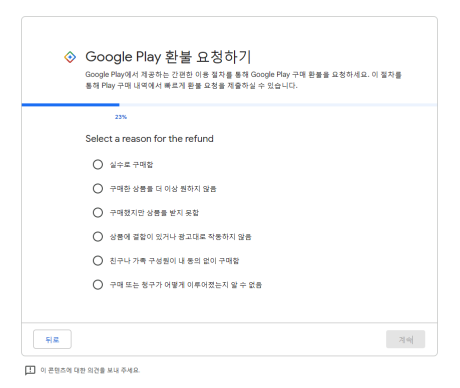 한두 건의 실수로 결제가 된 경우에는 이러한 방식으로 환불을 진행해 주시면 구글에서 검토 후 환불을 진행해 줍니다.