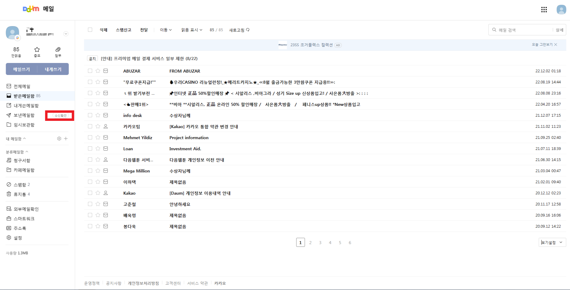 1. 다음 메일함에서 좌측에 표시된 수신확인 버튼을 눌러주세요.