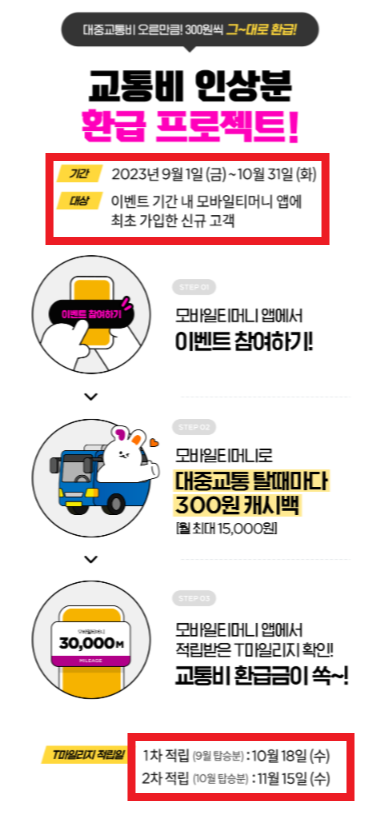 3. 이밴트내용 대중교통 이용시마다 300원 캐시백 (월 최대 15,000원) 9, 10월 모두 참여 시 최대 30,000원