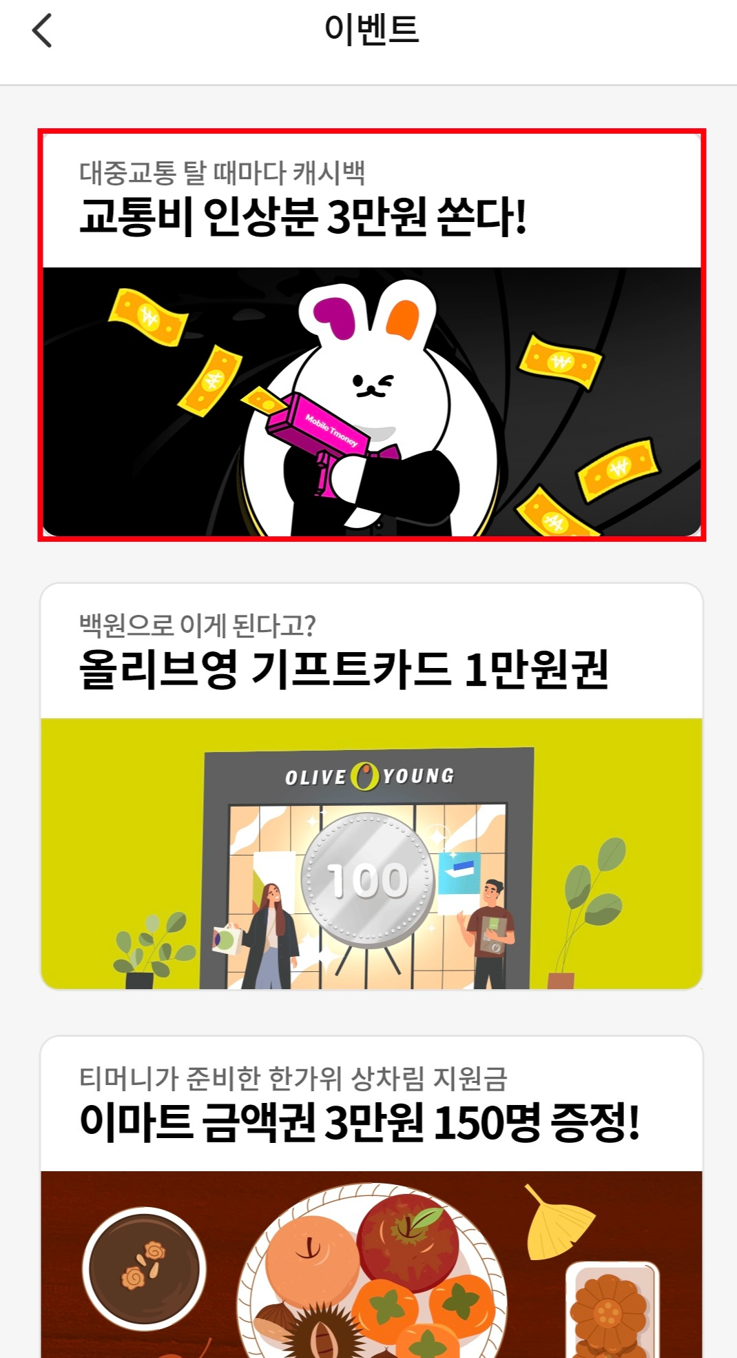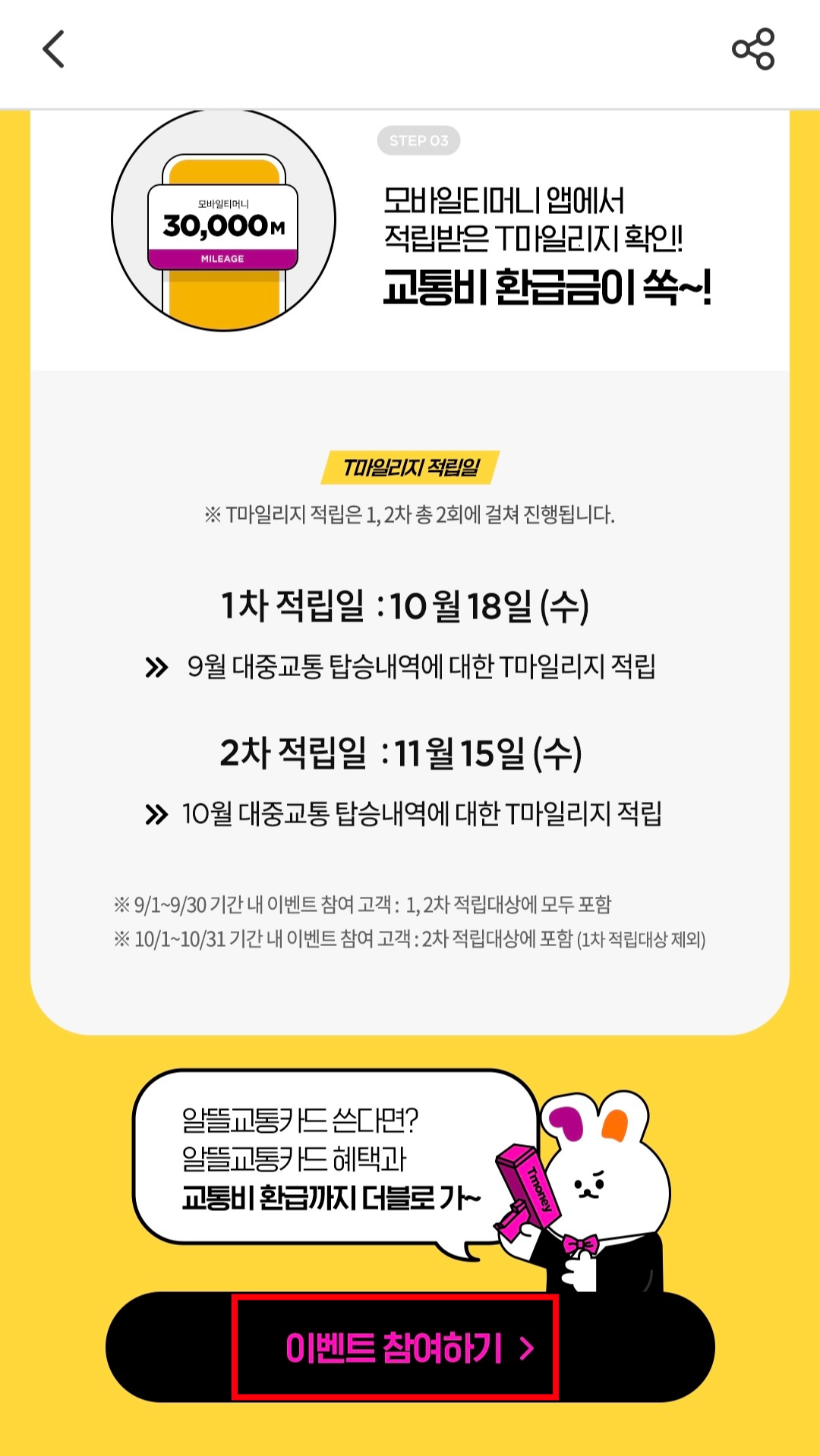 ※주의사항으로는 삼성페이 티머니 교통카드, 페이코 티머니 교통카드 등 제휴 모바일 티머니 서비스로 전환한 회원은 이밴트 대상에서 제외입니다.